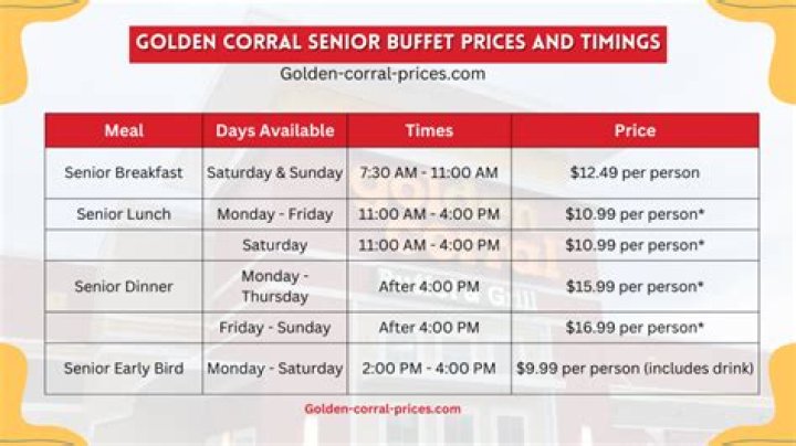 Keep in mind that the senior discount is only available during specific hours, typically during lunch service. Additionally, the discount may not apply to certain holidays or special events, so it's wise to confirm with your local Golden Corral before visiting.